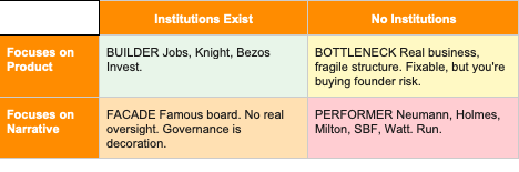 Dimension 2: What has the founder built around themselves? Are there structures (a real board, real governance, people who can say no) that could survive the founder's departure? Or has the founder dismantled every check? Knight built Nike with a real board and real succession planning. Bezos stepped down and Amazon continued. Now look at the other side. Milton had no one reviewing his public statements before he made them. Bankman-Fried had no board to speak of. One builder, one absence of governance. The difference is visible from the outside.
